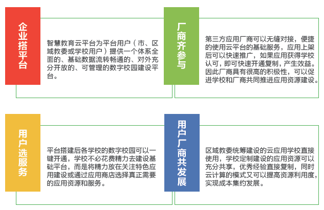 云平台提供了培育优秀应用产品的优质土壤,终将促进形成一个自我优化的云数字校园生态体系。
